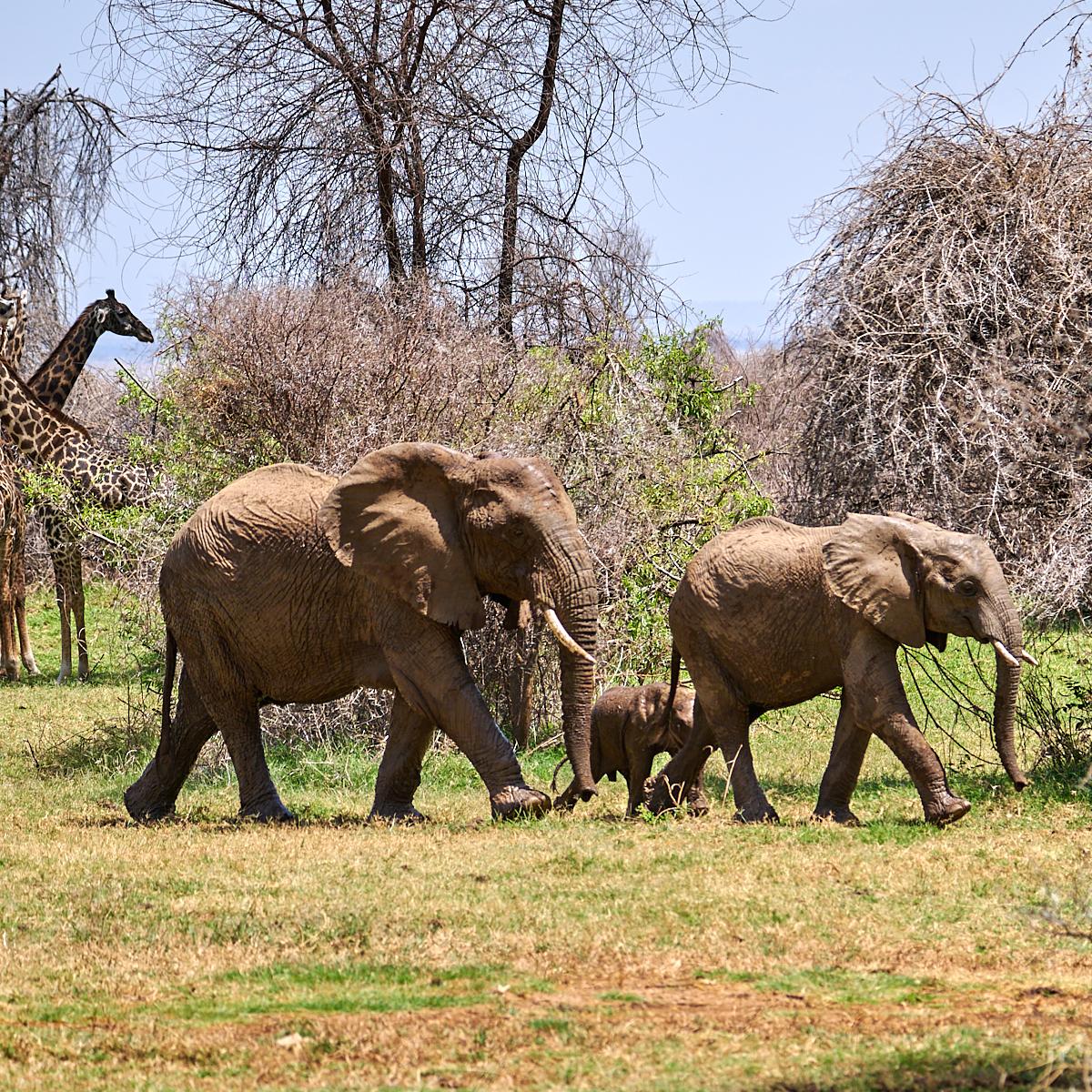 Elephant family with five giraffes | Lake Manyara National Park | Tanzania